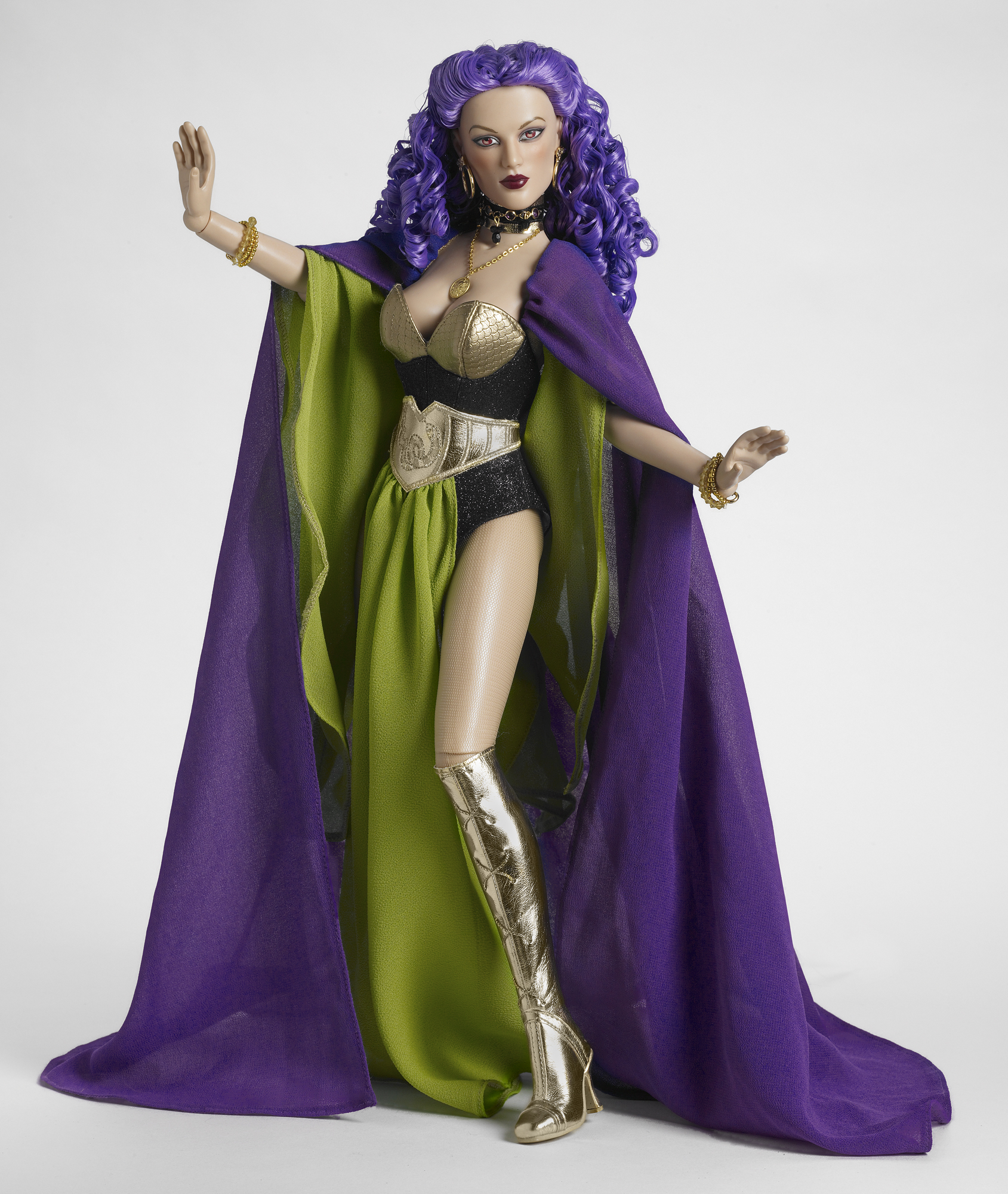 A Tonner "On Film" Convention (2009, Lombard, IL) and Wizard World Philadelphia 2009 exclusive! WONDER WOMAN's most alluring adversary is preparing some nefarious sorcery against her mortal enemies, the Amazons. CIRCE comes with an athletic female body and rooted purple saran hair. She is clad in a sparkling faux leather bodysuit under a lustrous gold faux leather corset with serpent embroidery and green chiffon sleeves and skirt. A richly-colored purple chiffon cape drapes from her shoulders. Completing the outfit are gold hoop earrings with purple and black acrylic gemstones, a multi-strand black and gold faux leather choker, gold beaded bracelets, a gold serpentine armband, nude pantyhose, and glimmering gold faux leather lace-up boots. The doll includes a display stand and certificate of authenticity.