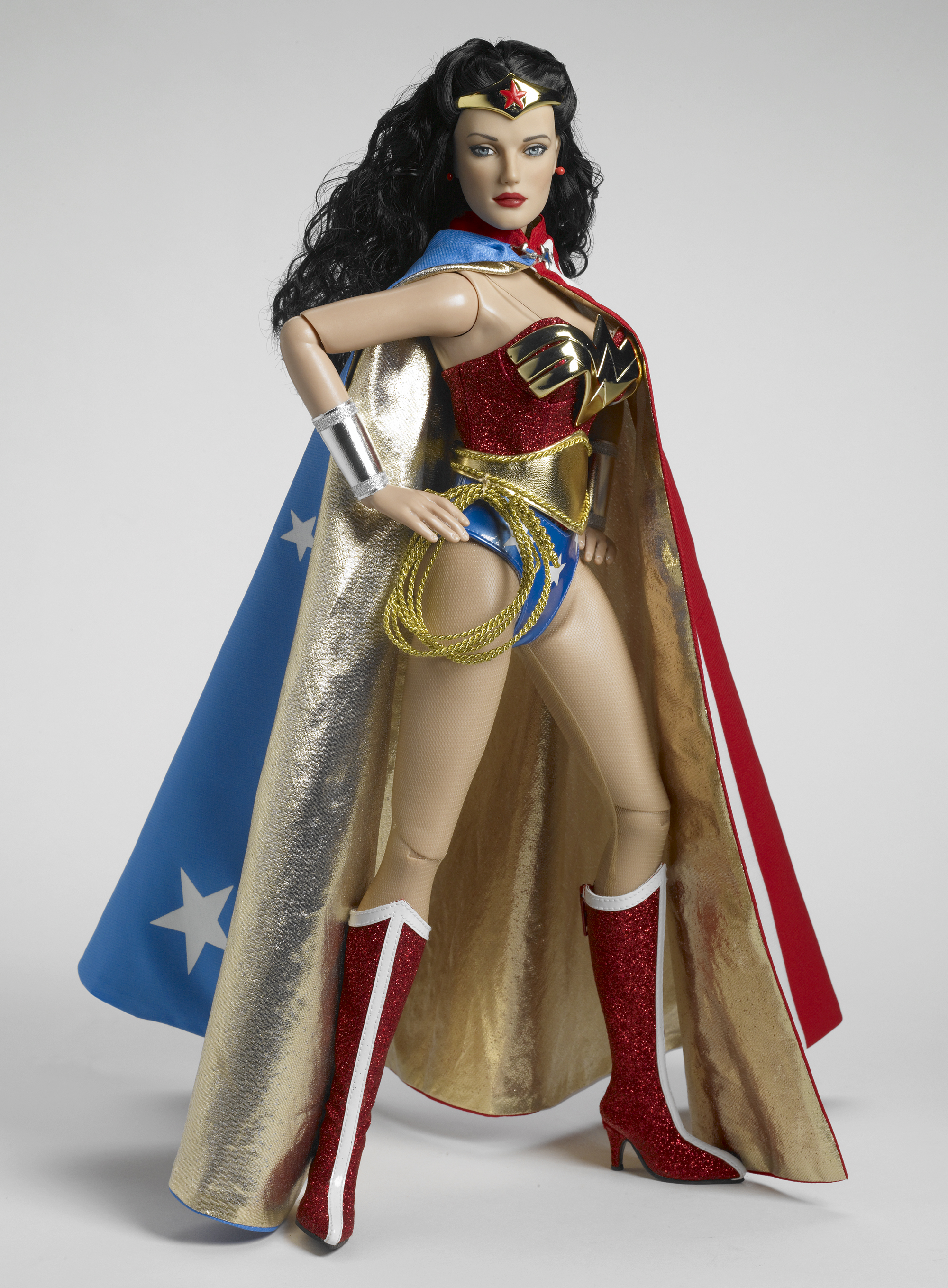 Tonner debuts the largest traditional WONDER WOMAN doll yet with this 22" doll which features an American Model head and body, rooted eyelashes and black rooted saran hair, and a bloom skintone. The doll is wearing a red glitter bodice with gold metallic electroplated plastic breastplate, blue panties with white stars, gold faux leather belt with trimmed edges, a golden lasso, a gold metallic electroplated plastic tiara, silver faux leather bracelets, nude hose, red earrings, and red and white faux leather zip-up boots. She has a reversible cape with red-white-blue stripes and stars on one side, and metallic gold on the inside. The doll comes with a display stand.
